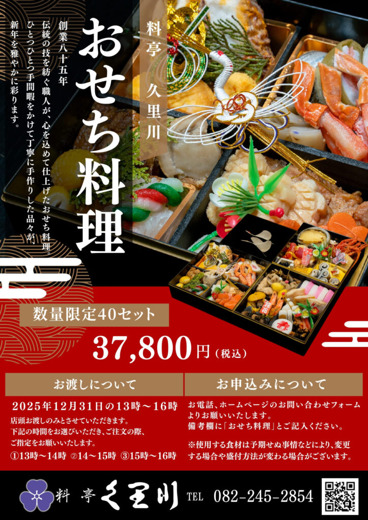 久里川では、厳選した旬の食材を使い、伝統の味わいに現代の感性を加えた特製おせちをご用意いたしました。